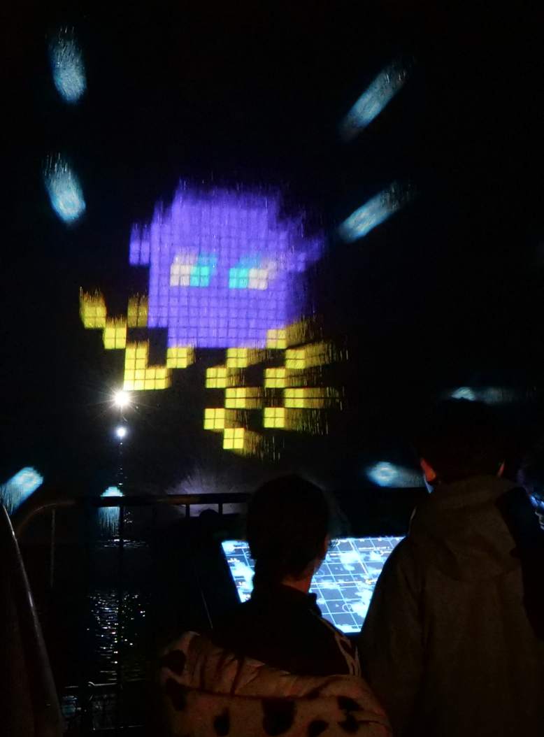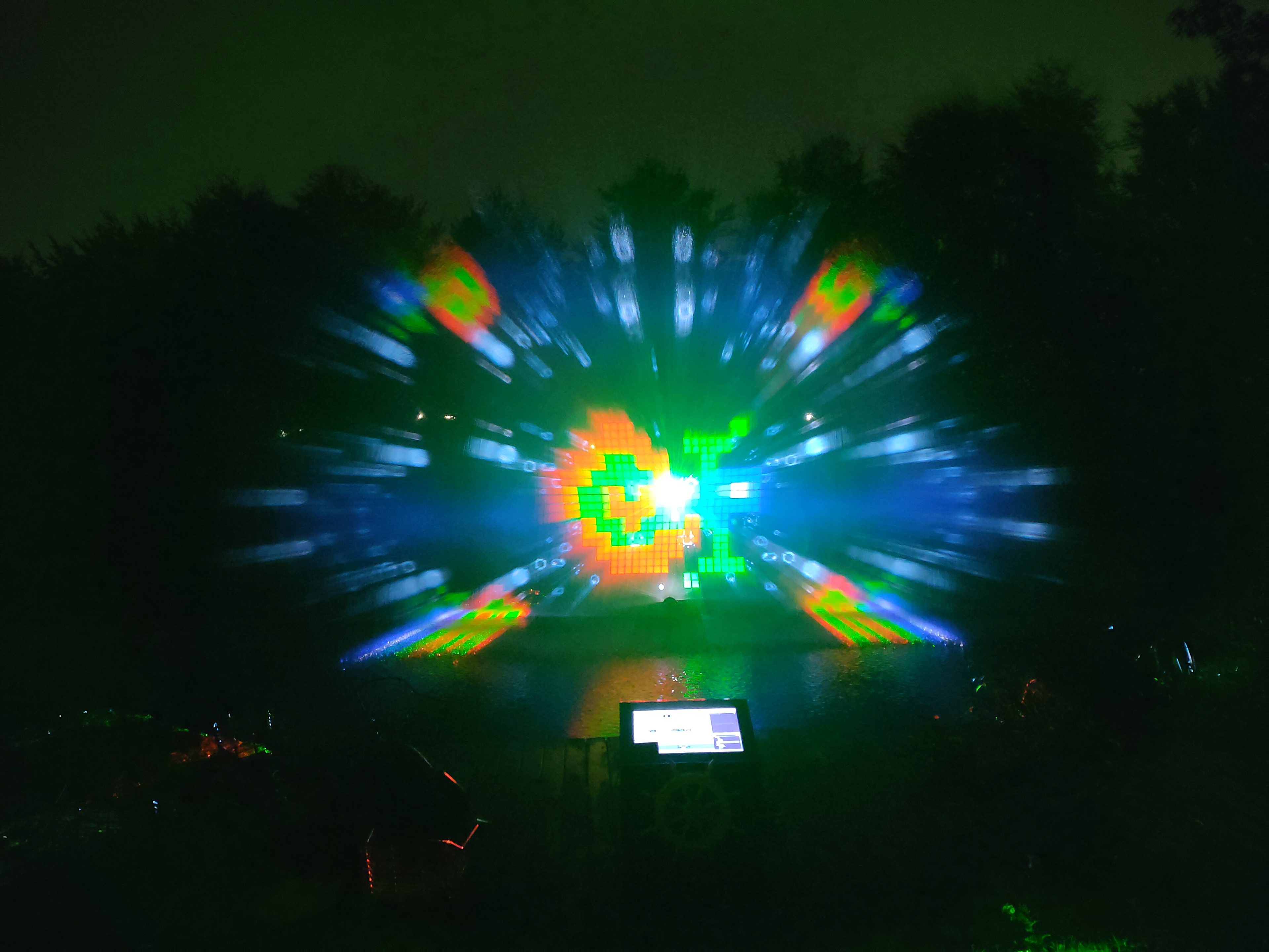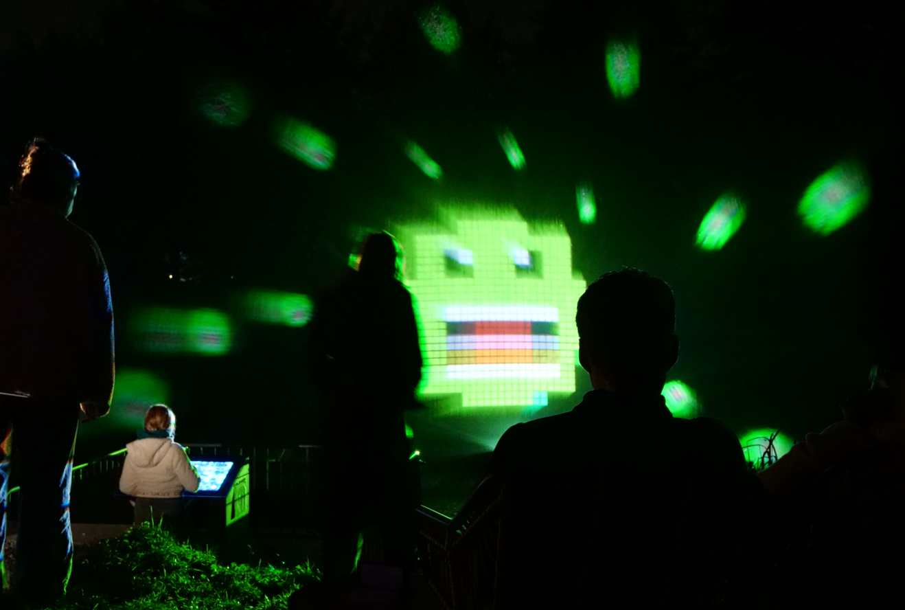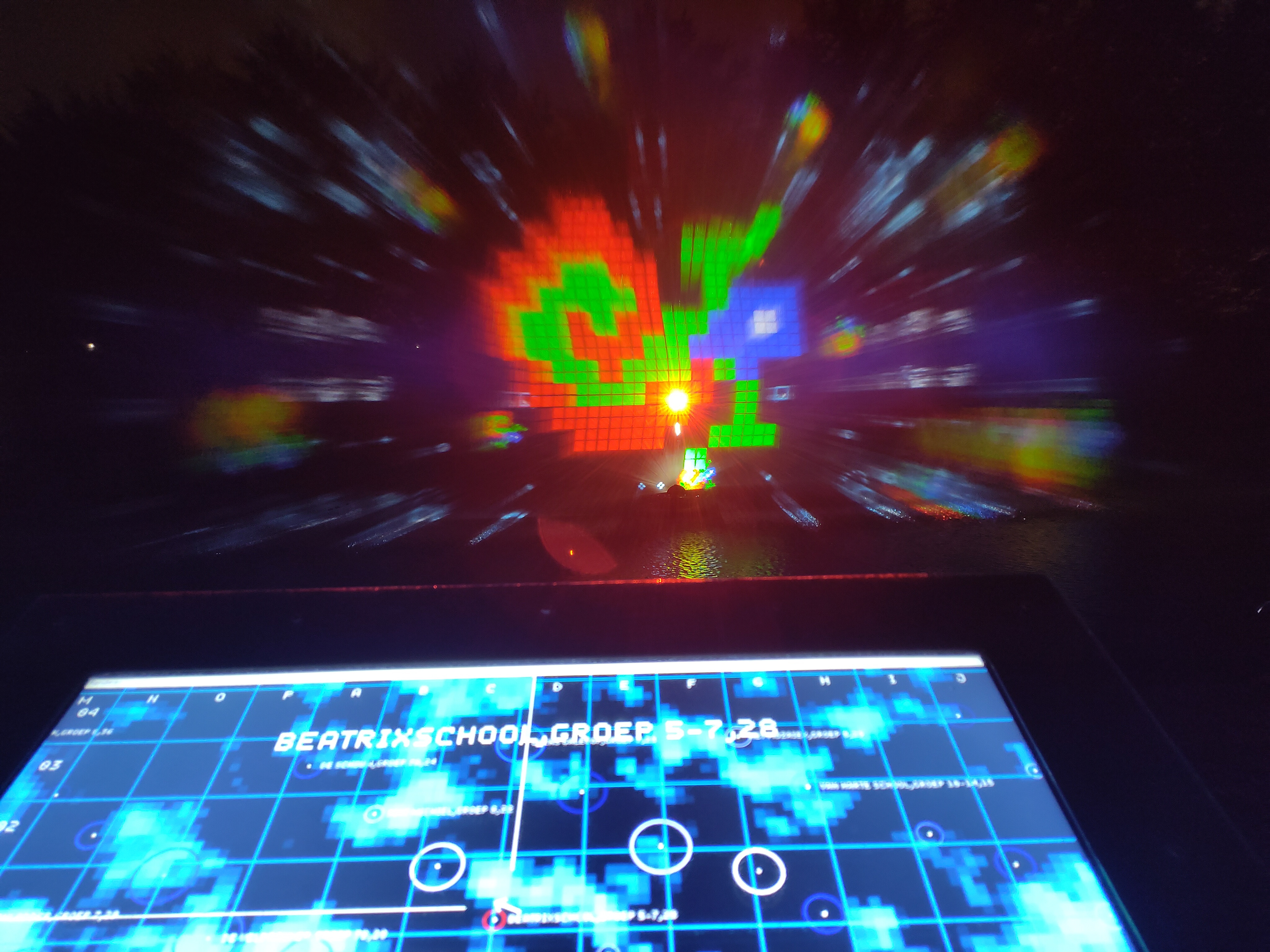 For VONK Festival we created an outdoor installation showcasing over 5000 little Pixel Plankton animations created in workshops with group 7/8 students at the schools in and around Houten, where the exhibition took place. With an interactive cruise controller the vistitors navigated projections on a large fountain, discovering a virtual ocean. The fantastic creatures made by the students were inspired on planktonic marine life, in an education program with examples and research in the classroom developed by Meester Pixel using our Lichtpuntjes workshop program.